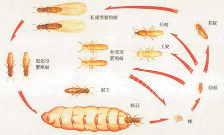 一巢成齡的臺灣乳白蟻,它們的成員有蟻皇、蟻后、兵蟻、工蟻。若蟻等。它們的結構式非常之嚴謹,品級分工清楚,蟻皇授精,蟻后產卵,兵蟻守衛(wèi),工蟻覓食勤務,若蟻待成熟長翅,分飛自立成巢。白蟻怕光,喜陰暗潮濕的環(huán)境。工蟻外出覓食,將食物消化轉換成養(yǎng)分,喂養(yǎng)巢內各品級白蟻,白蟻個體與個體之間營養(yǎng)均衡,相互清潔身體,相互撫慰,主要造成我們家居破壞的是工蟻——“破壞王”,它們尋找食物的半徑約100米。